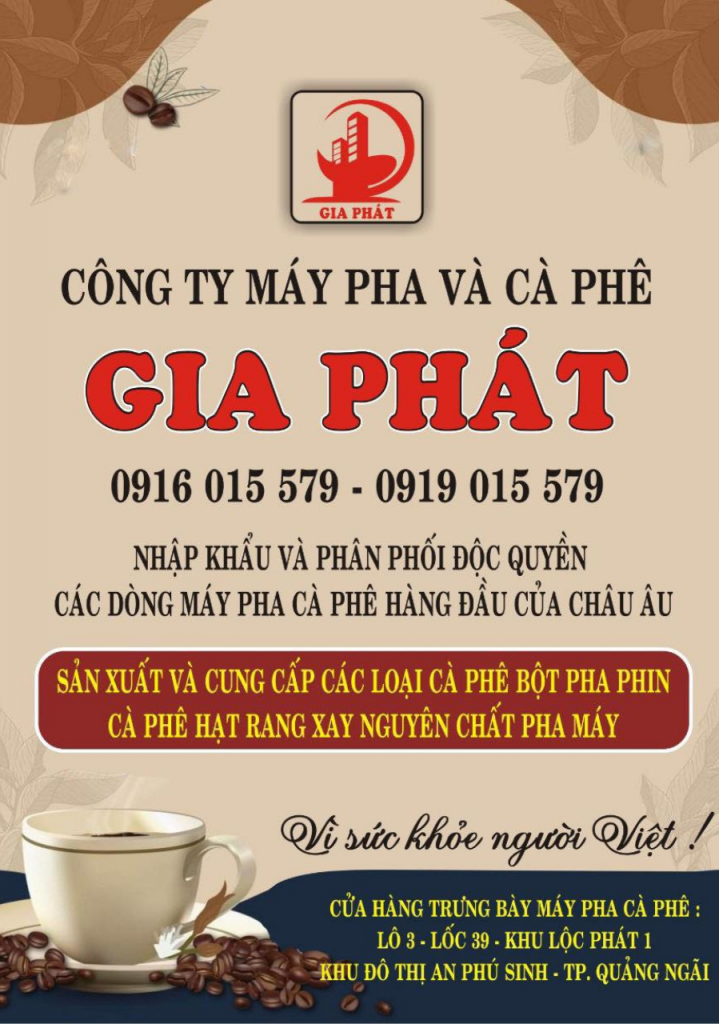 Công ty TNHH Sản xuất – Thương mại và Dịch vụ Gia Phát là công ty chuyên sản xuất và chế biến cà phê. GIA PHÁT COFFEE chính thức ra đời từ năm 2005, tiền thân là một nhà sản xuất, rang xay và chế biến cà phê với trên 20 năm kinh nghiệm cộng với những bí quyết pha chế cà phê độc đáo và kết hợp hài hòa những hạt cà phê ARABICA, ROBUSTA, CATIMOR. GIA PHÁT COFFEE đã đem đến cho bạn một hương vị cà phê đặc trưng, thơm ngon mà không thể nhầm lẫn. Chúng tôi tin rằng sau mỗi ly cà phê Gia Phát mà bạn thưởng thức luôn đem đến cho bạn một ý tưởng sáng tạo và một nguồn sảng khóai đến vô tận để cùng bạn vươn đến thành công trong công việc cũng như trong cuộc sống.